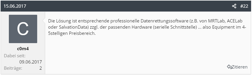 Die Daten auf der Platte sind zwar nicht lebensnotwendig, aber da sich dort massenhaft Familienbilder/Videos befinden die man so nie wieder bekommen kann (verstorben etc), will ich zumindest versuchen die Daten zurückzubekommen. Eine professionelle Firma kommt dafür nicht in Frage, da mir hierfür schlichtweg das Geld fehlt.