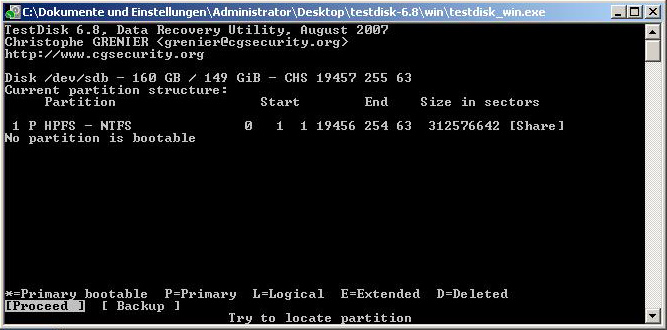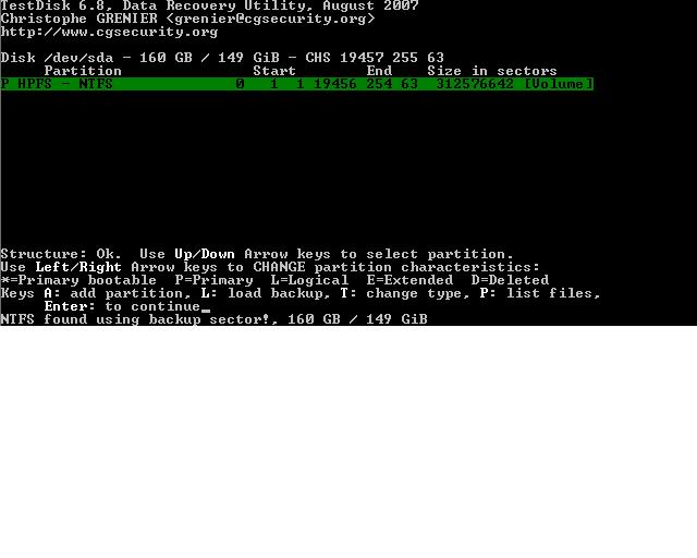 chkdsk Laifwerksbuchstabe: /r wäre auf eigenes Risiko.Wenn du p drückst und bei einer NTFS-Partition eine Daten siehst, kannst du eine Datei oder Ordner markieren und c für copy drücken.