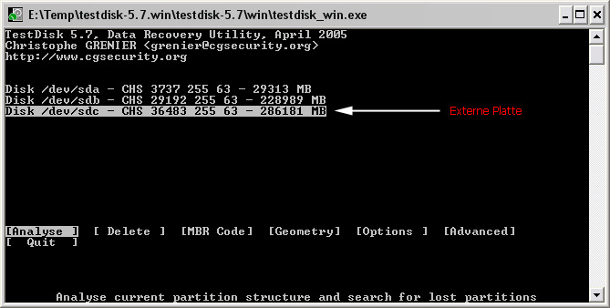 Habe Testdisk gestartet und dieser zeigt mir meine Lokale Platten: siehe screenshot2