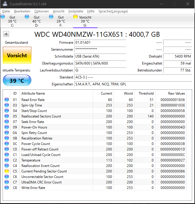 Alleine das Wechseln vom Laufwerk C: zum Laufwerk G: in der CrystalDisk Software hat mich fast 30 min gekostet.