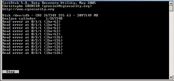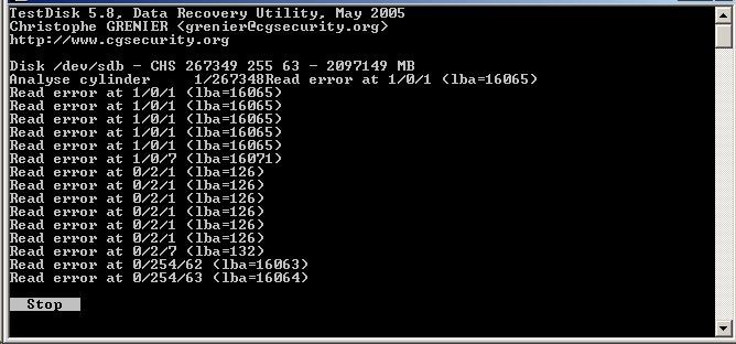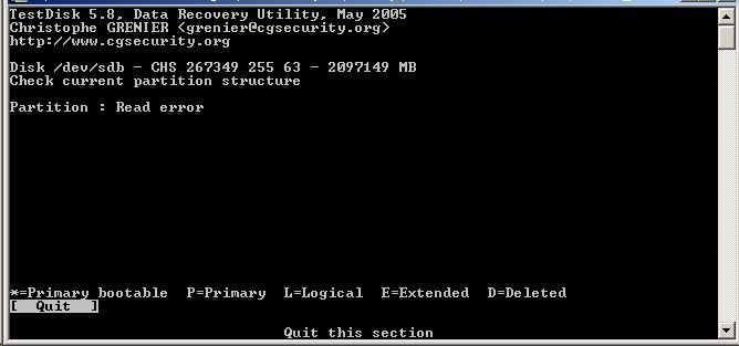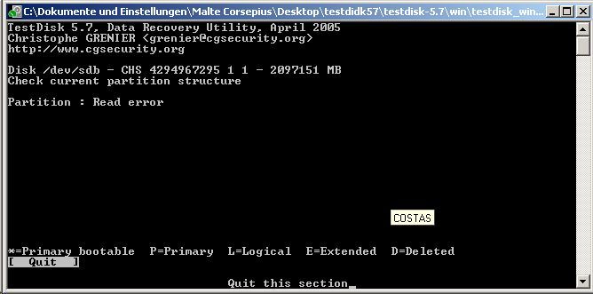 Ich habe testdisk 5.7 und 5.8 laufen lassen, beide melden "read error" (siehe screenshot, komisch auch, dass eine völlig unsinnige größe der platte angezeigt wird, sie hat wirklich nur 160GB...)