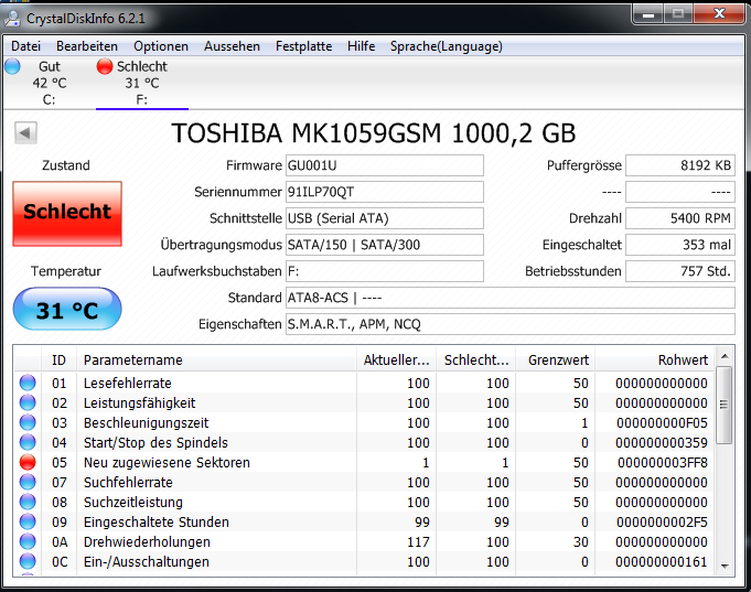 ich habe eine externe Festplatte Toshiba MK1059GSM, Intenso die vom Notebook zwar erkannt aber weder das Volumen angezeigt wird noch der Zugriff möglich ist. Klickt man die festplatte an, so wird diese lange geladen bis es mit einer Fehlermeldung abgebrochen wird:" Auf f.\ kann nicht zugegriffen werden. Falsche Parameter."