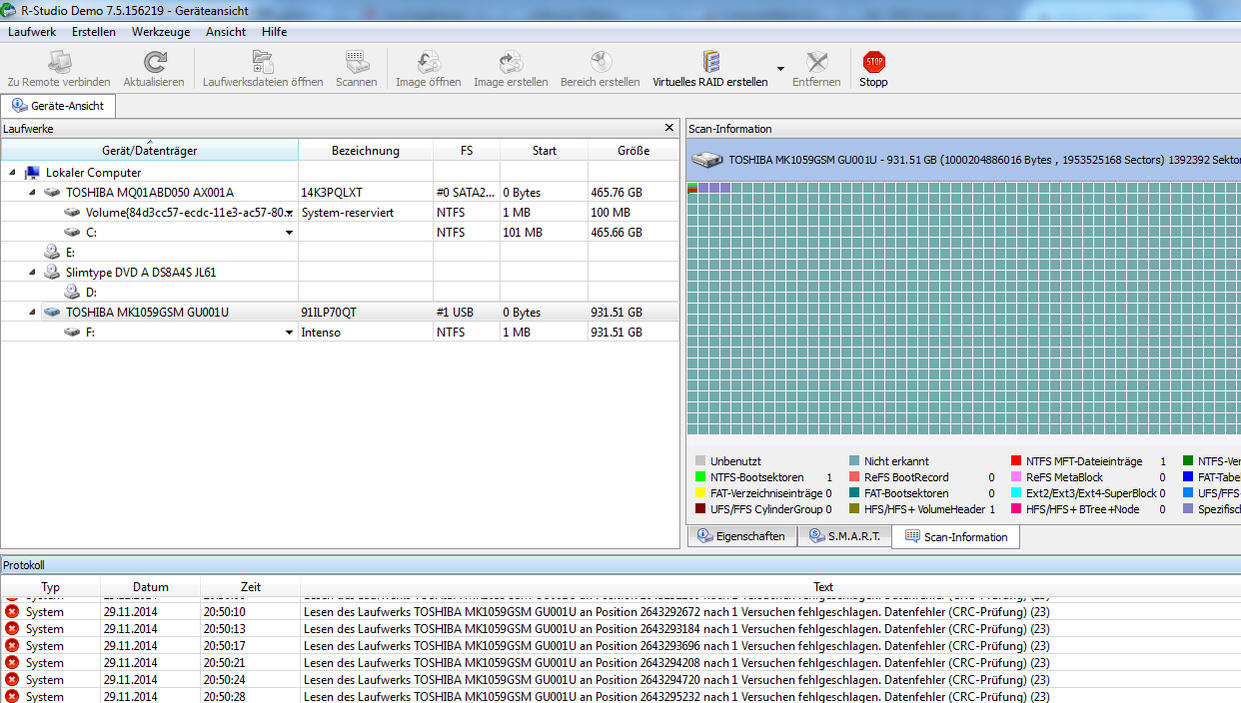 Im Anhang sind noch einige Bilder von testdisk, R-Studio und CristalDiskInfo.