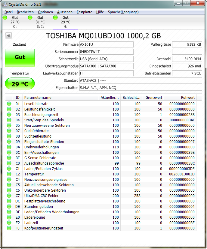 Ich habe schon einiges versucht in diesem Forum sowie im Internet zu recherchieren. Leider kann ich den Fehler, wenn es denn einer sein sollte, nicht lokalisieren. Ich habe mir eine externe Toshiba Festplatte (Toshiba Stor.e Slim 1TB silber ) gekauft und ganz normal am USB3-Port angeschlossen. Habe einige Daten rübergeschoben, soweit so gut. Kurze Zeit später fängt sie an seltsame Geräusche zu machen. Das Geräusch kann man nur schwer beschreiben. Auf einer Homepage, wo diverse Fehlergeräusche für verschiedenste Festplatten zum anhören waren, konnte ich es nicht finden. Habe es daher selber mal aufgenommen und füge es als Sounddatei an. Mit CrystalDiskInfo habe ich einen Zustandsbericht abgerufen, bin aber nicht nerd genug um die Daten darin zu verstehen. Habt ihr eine Idee woran es liegen könnte? Die Platte läuft ja, aber das Geräusch, welches auch nie aufhört, nervt gewaltig. Vielen Dank schonmal!