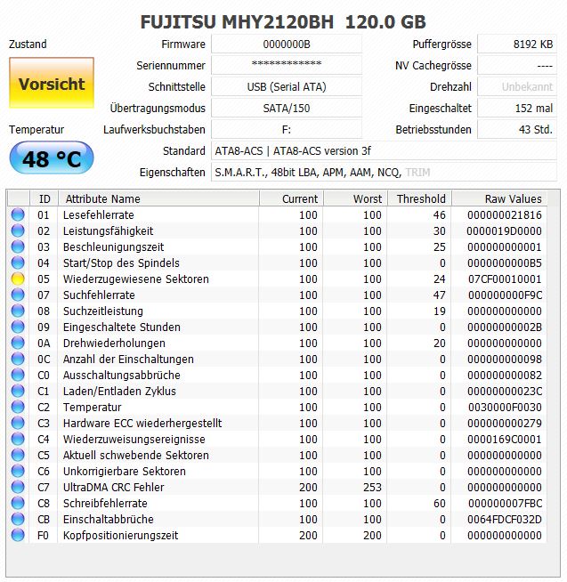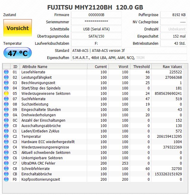 Ich habe heute gemerkt, dass meine externe Festplatte (2,5 Zoll) eine Warnung bei den SMART Werten anzeigt.