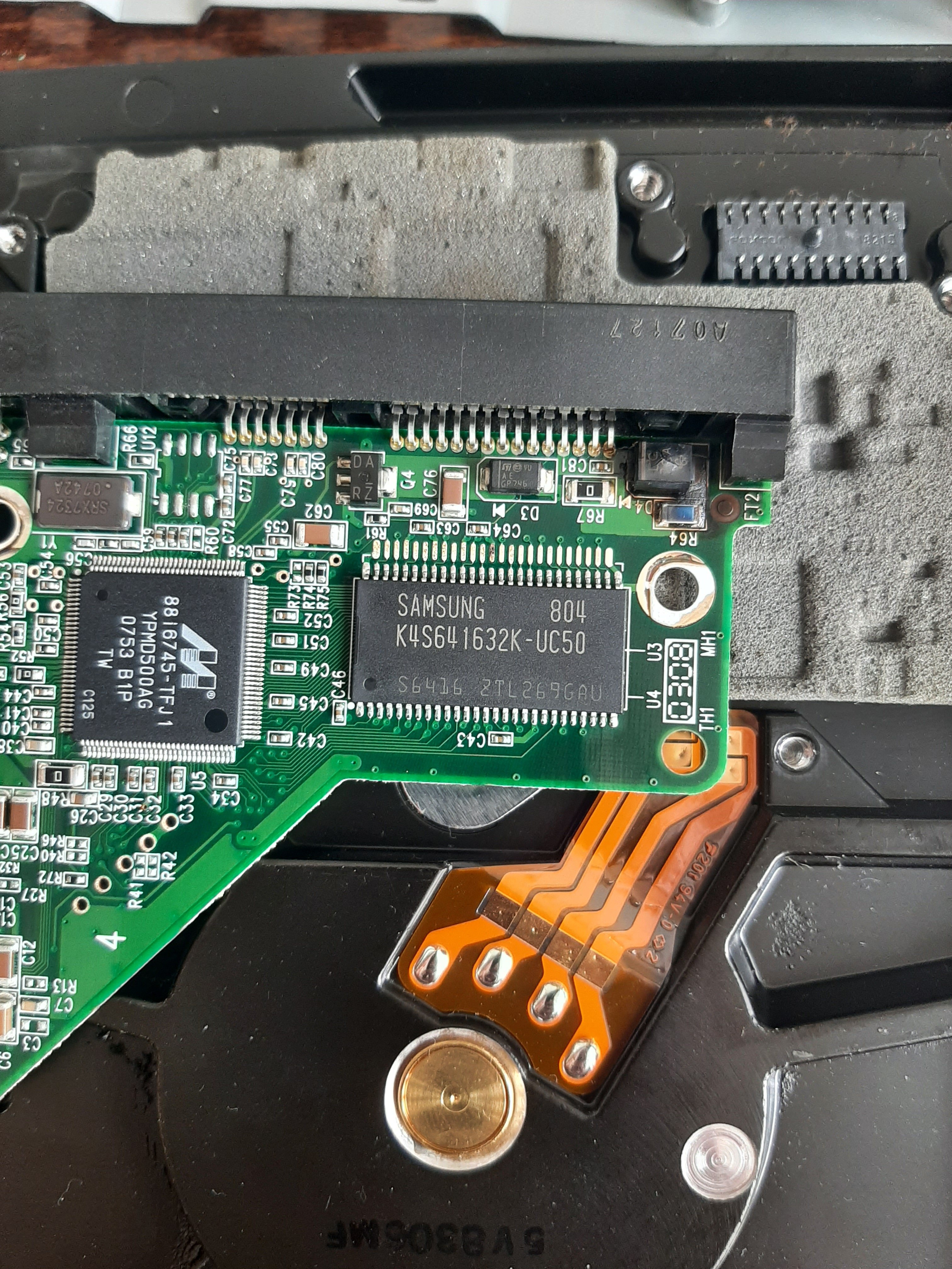 Heute morgen habe ich die Festplatte auseinander gebaut, um zu schauen, ob ich Sie an meinen PC anschließen kann. Da tut sich aber gar nichts. Ich habe ein paar Bilder angehängt in denen der Schaden zu sehen ist. Ich kann mir vorstellen, dass die Stromzufuhr der Festplatte durch den Knall gestern Schaden genommen hat.
