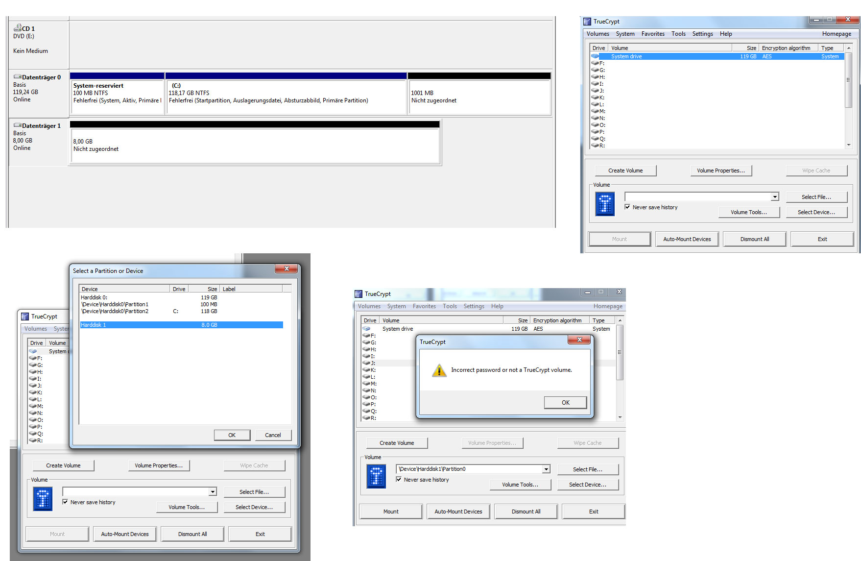 Wenn ich nun - wo Windows sie nicht mehr erkennt beim anschalten - auf "Auto Mount Divices" gehe, bekomem ich folgende Fehlermeldung: "Incorrect Password or no TrueCrypt Volume found".