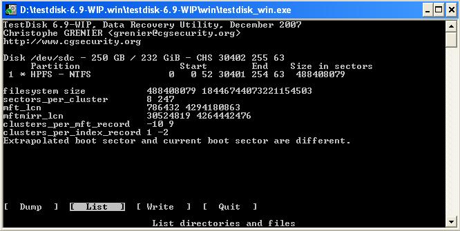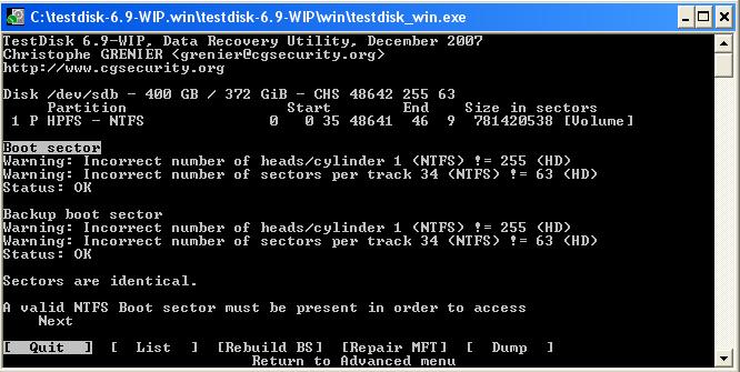 Setze die Geometrie in Testdisk auf 255 Heads und 63 Sektoren.
