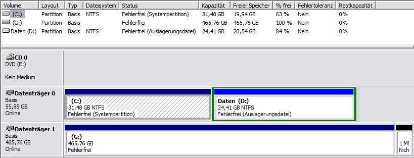- In der Datenträgerverwaltung wird der Datenträger G: fehlerfrei angezeigt, aber ohne Dateisystem und 100% frei
