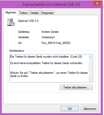 Im Geräte-Manager zeigt er mir bei "Mass Storage Device" und "External USB 3.0" zwei gelbe ! an.
