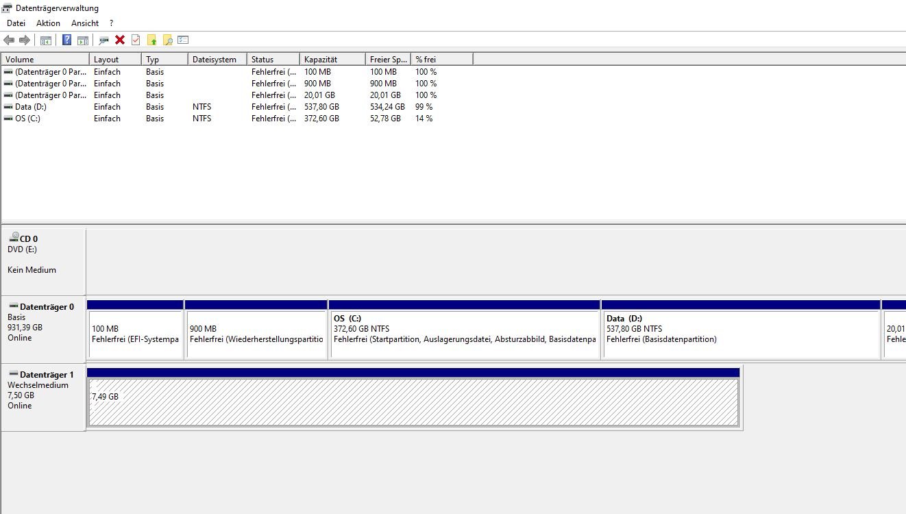 In der Datenträgerverwaltung wird das entsprechende Speichermedium unten in der Liste angezeigt, aber nicht oben in der Tabelle der Laufwerke (siehe Screenshot Datenträger 1)