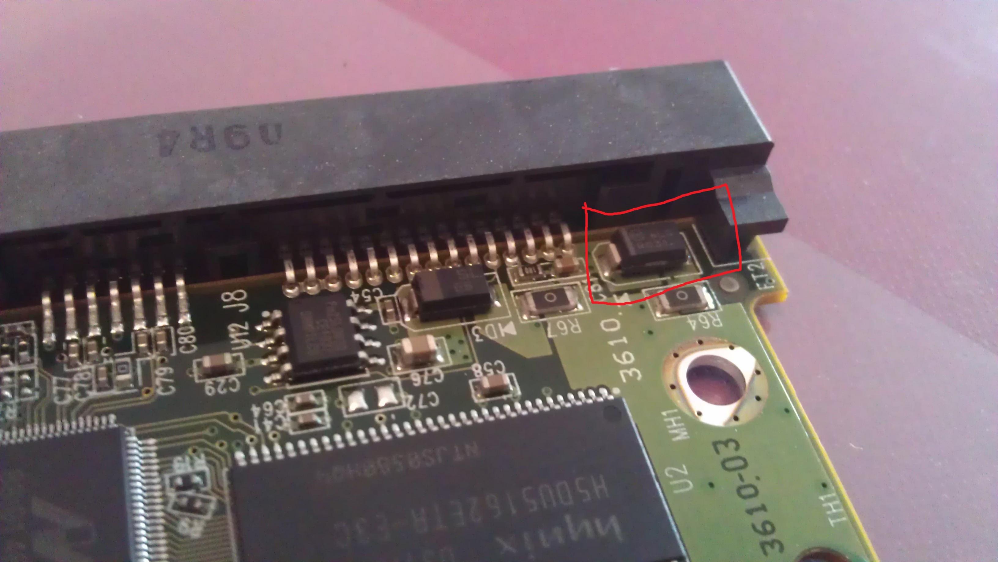 Aber die Schutzdioden befinden sich auf der HDD Platineninnenseite. Die Platine abschrauben, auf das Flachbandkabel achten und die Innenseite photographieren.