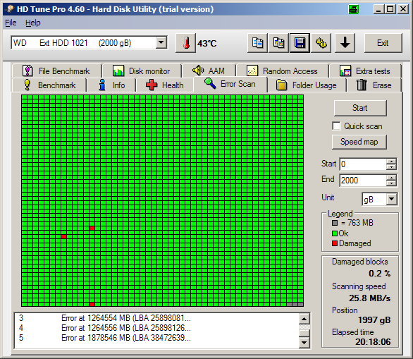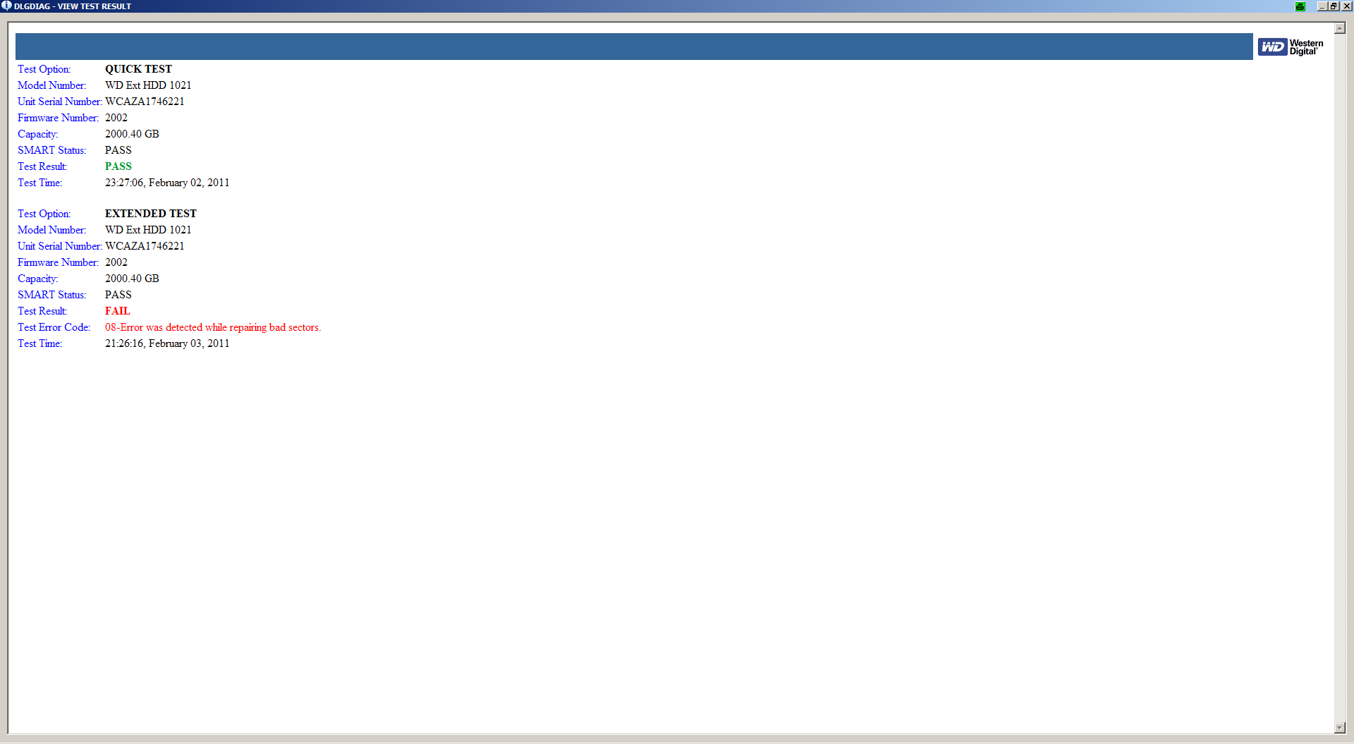 vor dem ersten gebrauch habe ich sie mit dem festplatten-tool des herstellers "Western Digital Data Lifeguard Tools" getestet. dieses lieferte das ergebnis in anhang 1.