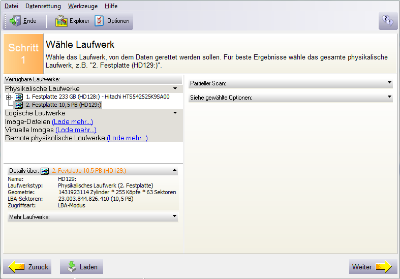 Versuche mit R-Studio (Festplatte wird angezeigt, das "Scan"-Feld ist allerdings ausgegraut) und Testdisk unter Windows (die Festplatte wird mit mehreren 1000 TB angezeigt und eine Analyse würde Tage dauern) und Ubuntu (Es wird nichts gefunden, die Festplatte hat allerdings in der Anzeige von Testdisk auch nur rund 500 GB).
