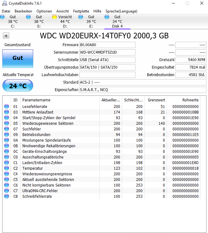 Anbei die CrystalDiskInfo "Diagnose", leider weiß ich diese Werte nicht korrekt zu interpretieren.