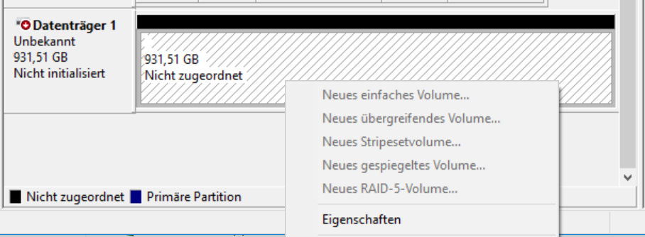 bei einem erneuten Rechtsklick auf die Platte ist die Initialisierung ausgegraut...
