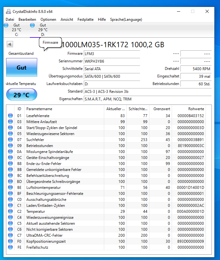Ach ja, interessanterweise wird mir auf D: 900GB angezeigt, was der Laptop auf keinen Fall hat. Ich hatte auf D: mal andere Festplatten angeschloßen und irgendwie steht das da immer noch.