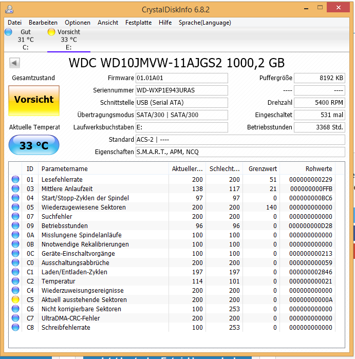 Von Minute zu Minute wurde immer weniger erkannt. Erst konnte ich im Explorer noch den verfügbaren Speicherplatz sehen. Nach erneutem Anschließen (sicheres Entfernen) wurde der Speicherplatz nicht mehr angezeigt. Bei Doppelklick auf die Platte blinkt sie nur und arbeitet, aber der Explorer hängt sich auf (keine Rückmeldung im Titel und unendlicher Lade-Kreisel). Ich kann also auch keinen einzigen Ordner mehr sehen. Zu Beginn kam nach minutenlanger Wartezeit vom Explorer der Fehler: "CRC-Fehler". Jetzt kommt immer "falscher Parameter".