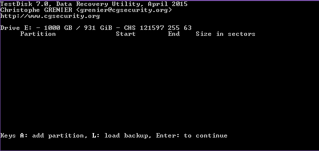 Ich habe mir TestDisk runtergeladen und die Partitionen gesucht. Ergebnis: keine Partition gefunden.