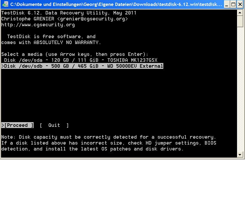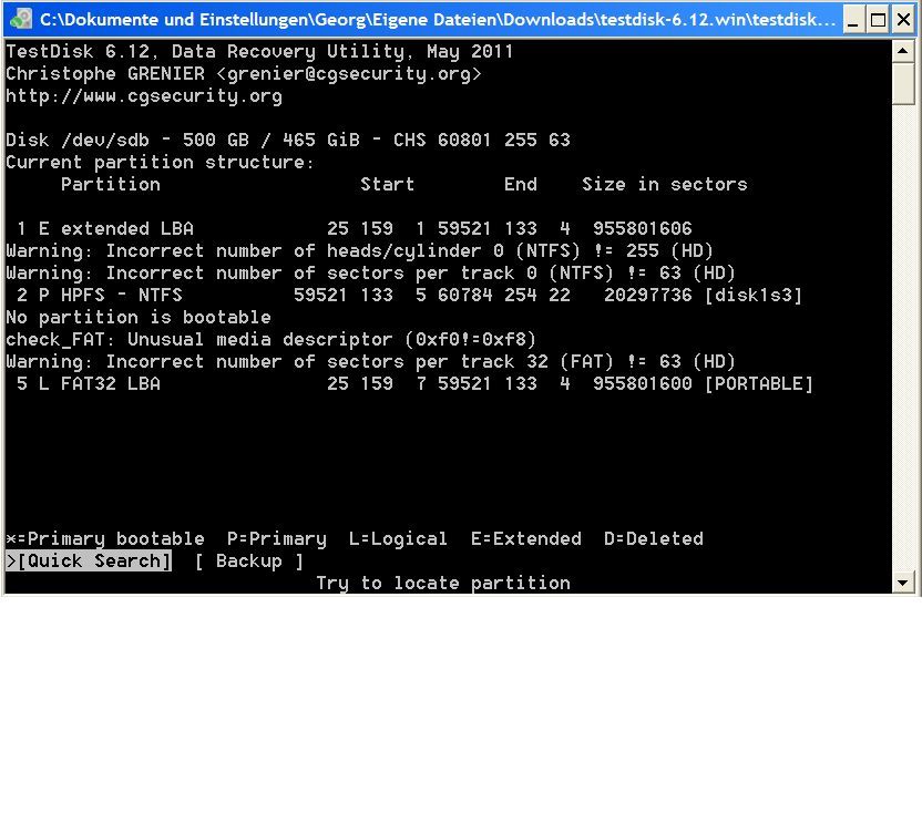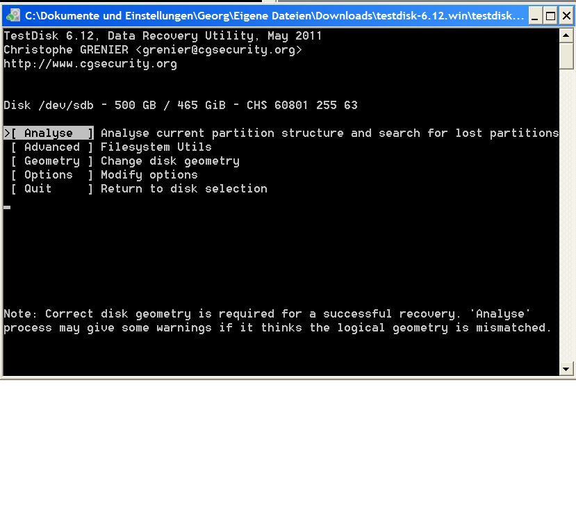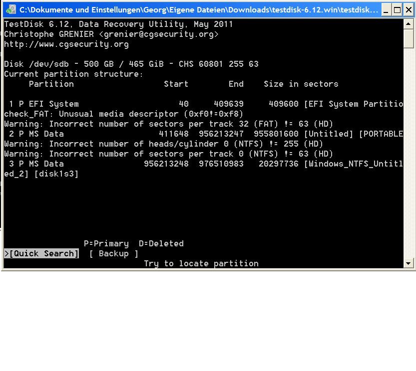 Screenshot TestDisk lief unter WinXP.