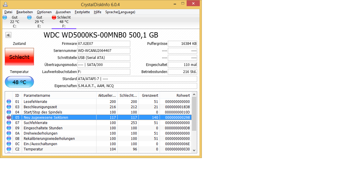 meine externe Festplatte, für meine Backups zeigt bereits nach 216 Std. bei Neu zugewiesenen Sektoren den Zustand "Schlecht" an.