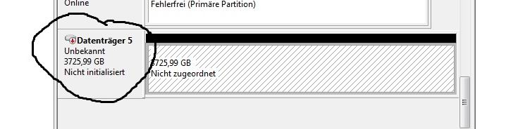 - Die HD wird auch in der Datenträgerverwaltung angezeigt, allerdings mit falscher Größe, nicht initialisiert, unbekannt und nicht zugeordnet. Die einzigste Option ist hier wohl, die HD zu initialisieren, was ich noch nicht getan habe.
