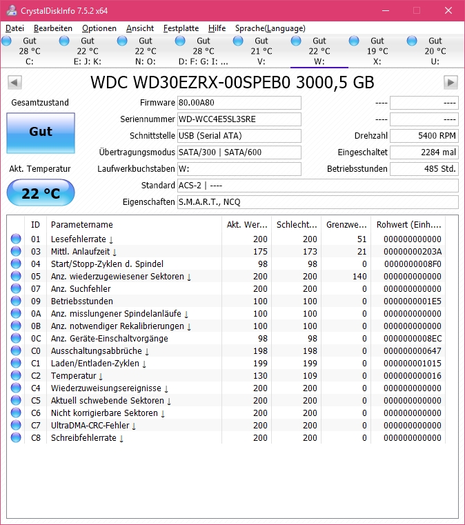 Ich habe zwei Exteren HDs, die ich nur ab und zu anschalte. Eine davon, eine 3TB WD MyBook, macht Probleme. Nach einigen Minuten in Betrieb, schaltet sie sich selbst ab und ein mehrere Sekunden (bis zu 5 Sekunden) später, wieder ein - oder anders gesagt, sie meldet sich ab und wieder an. Dies passiert unregelmäßig. Ansonsten arbeitet sie fehlerfrei.
