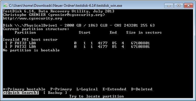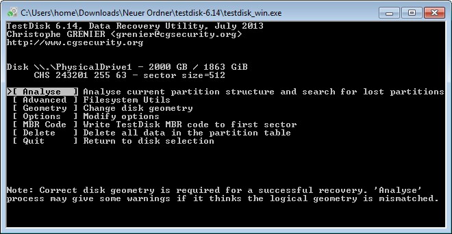 Starte Testdisk bestätige bei dem Log-Datei-Screen mit Enter, wähle deine betroffene Festplatte aus und bestätige mit Enter, bestätige bei Partition Table Typ