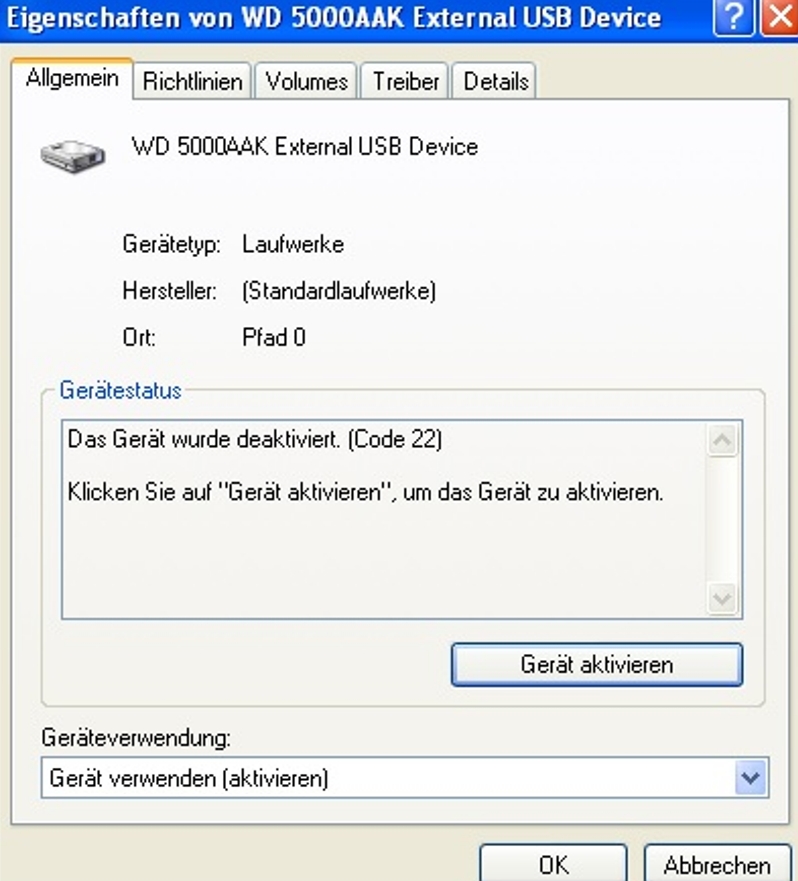 "Das Gerät wurde deaktiviert. (Code 22)