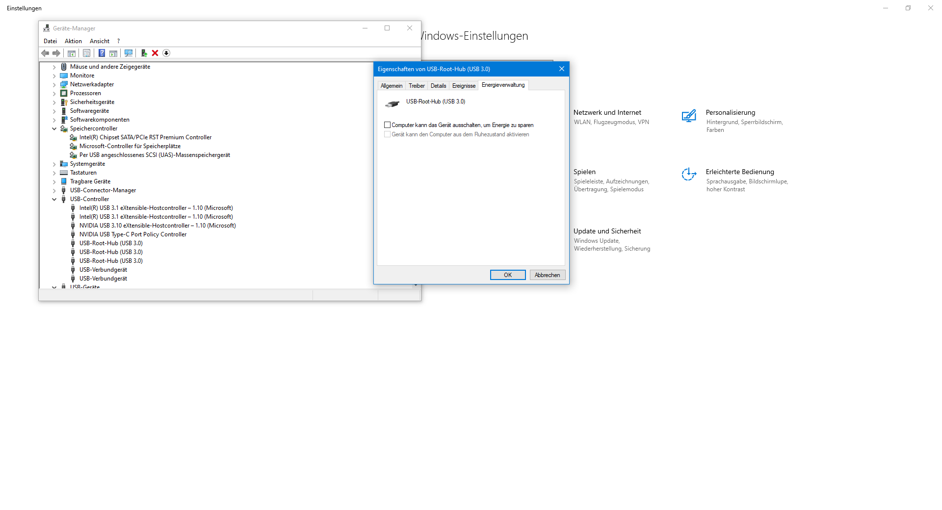 - Geräte-Manager -> USB-Controller -> "USB-Root-Hub (USB 3.0) -> Eigenschaften -> Energieverwaltung, dort das Häkchen "Computer kann das Gerät ausschalten, um Energie zu sparen" entfernt