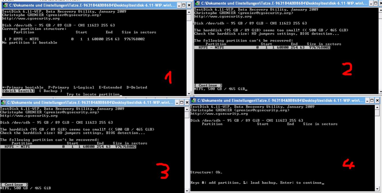 Habe Testdisk soweit mir möglich laufen lassen. Das Programm erkennt die HDD als 95GB-Platte (sie ist aber 500GB groß) und rät dazu, Jumper und BIOS Erkennung zu checken (kenne mich da aber absolut nicht aus ...)