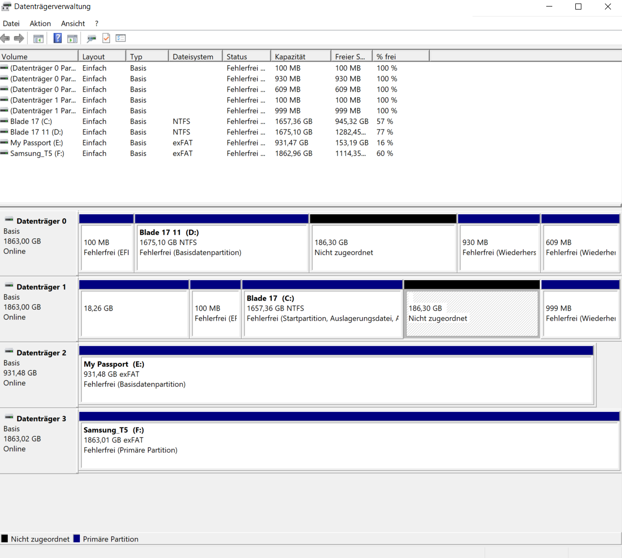 Einziger Unterschied: beim Windows 10 Laptop zeigt es zwei Laufwerksbuchstaben mit Fragezeichen im Explorer an, die aber auch nicht weiterführen, in der Datenträgerverwaltung sieht es exakt gleich aus wie im obigen Bild.