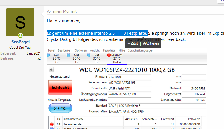 CrystalDisk gibt folgendes, ich denke nicht so zuversichtliches, Feedback: