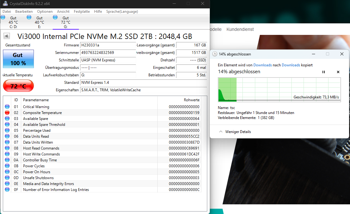 Ich habe Verbatim Vi3000 2TB, 3300MB/s Schreiben, 3000MB/s SLC-Cache.