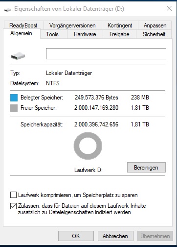Wenn ich in die Eigenschaften der Platte gehe wird mir auch weiterhin angezeigt, dass 240 MB belegt sind, In der Kreisgrafik sind dann die vollen 2,0 GB zu sehen, aber die 240 sind nicht mehr als belegter Speicher dargestellt.