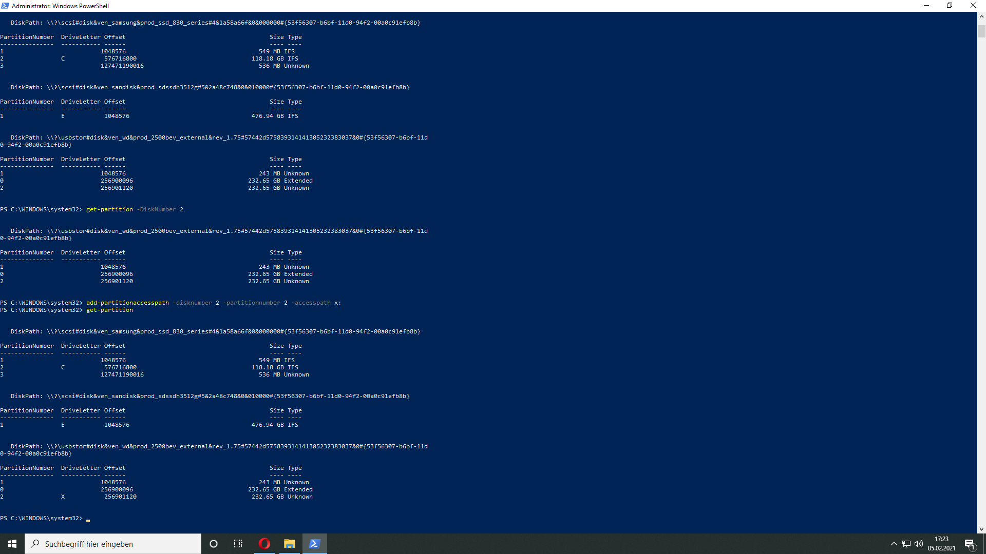 edit : nach Windows Neustart zeigt Powershell die USB HDD Partition2 wieder ohne Laufwerksbuchstaben X an