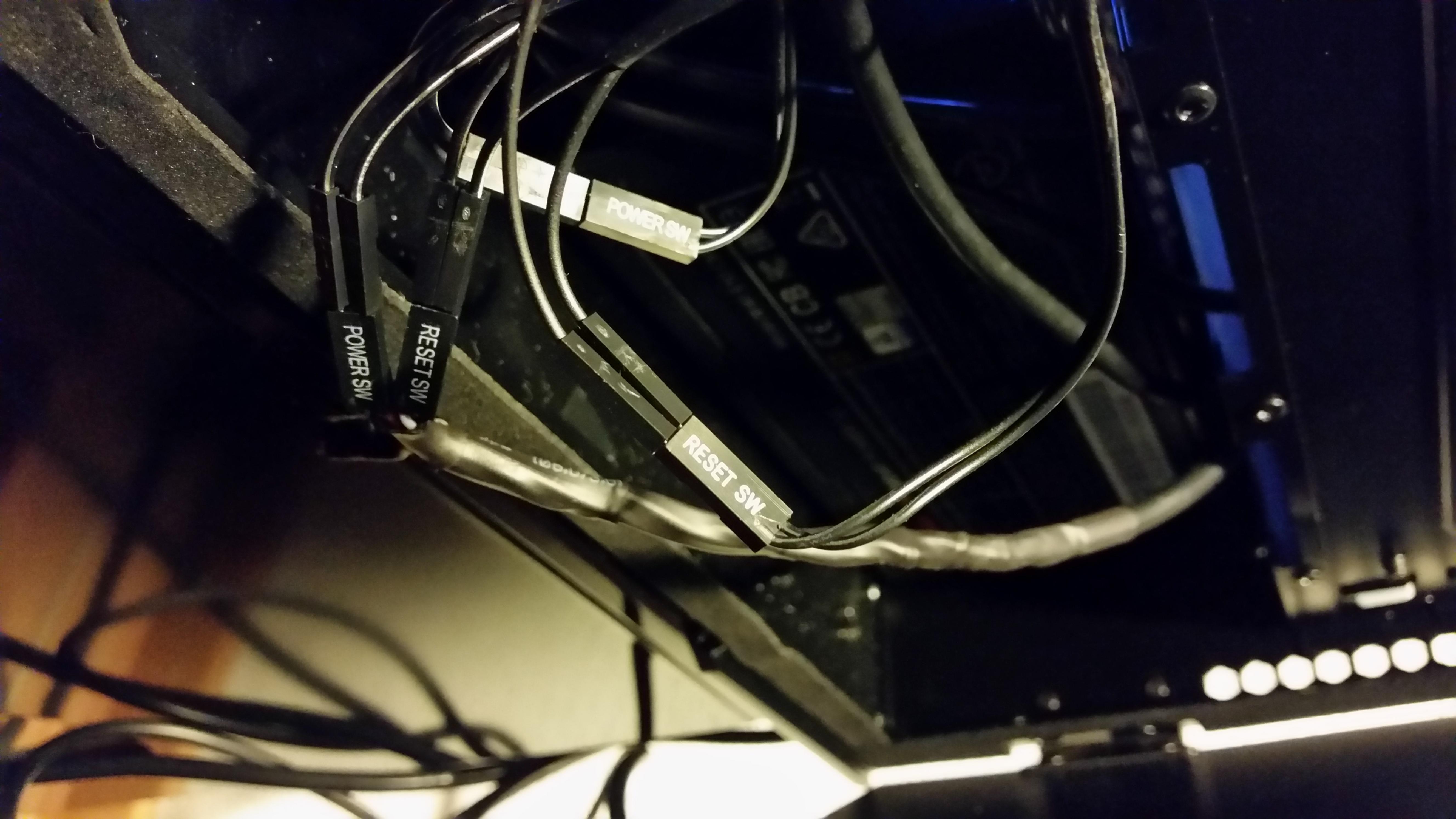 Dann einfach einen Eingang genommen und am anderen Ende zwei Ausgänge drangelötet und isoliert. Halt Y-Kabel. Das dann 4mal. Jeweils für Power +/- und Reset +/- zwei Ausgänge damit ich beide Power/Reset am Case und den gekauften paralell benutzen kann. Die HDD LED und PWLED brauche ich für den externen Switch nicht. LED würde nur stören.