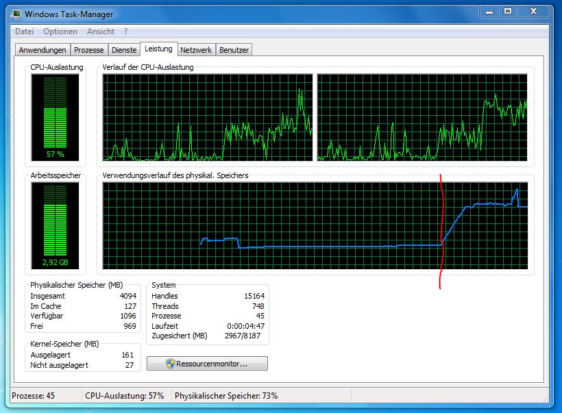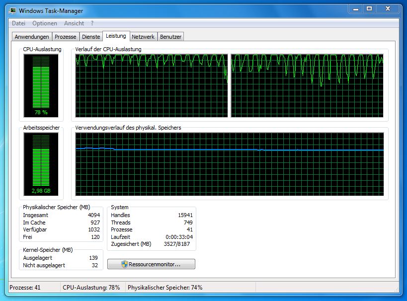 ich habe auf meinem System, Windows 7 64bit frisch installiert und habe eine sehr hohe CPU- und RAM-Nutzung. Bisher benutzte ich Vista 32bit. Direkt nach dem Systemstart wird bereits mindestens 1 GB RAM verbaucht, wobei die CPU nach den ersten Minuten bei 0-10% bleibt. Beide Werte springen jedoch enorm sofort in die Höhe, sobald ich irgendetwas mache und bleiben auch dort, auch lange nachdem ich alle ggf. geöffneten Programme wieder geschlossen habe. Ich habe dazu unten mal Screenshots des Task-Managers angehängt. Trotz der hohen Werte ist der Rechner aber nicht (übermäßig) lahm. Ich habe ihn jedoch bisher auch noch nicht ausgiebig genutzt, weil ich ihn ja gerade erst neu installiert habe.