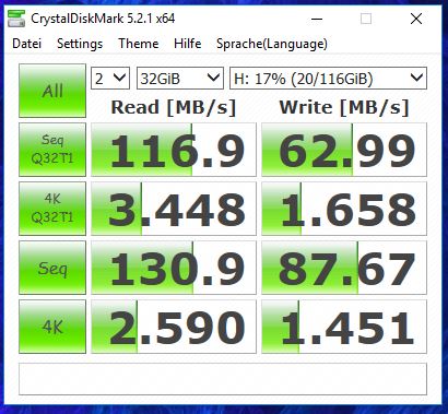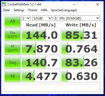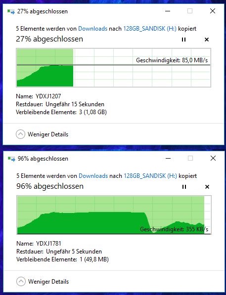 Die 85MB/s am Anfang kommen damit zustande daß eben nicht geschrieben wird, sondern nur der Cache im RAM gefüllt wird. Sobald der voll ist bricht die Rate ein. Aber der Stick kann eben nur 18MB/s und dann muss ja auch noch der Cache geleert werden.