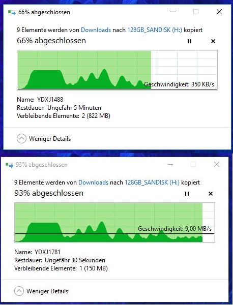 So ist es, denn der Explorer zeigt beim Kopieren die Rate aufgrund der schon gelesenen Datenmenge an, also praktisch während der den Cache füllt die Lesegeschwindigkeit der Quelle und nicht die Schreibgeschwindigkeit des Ziels. Deshalb endet der Kopiervorgang scheinbar auch ewig nicht, obwohl es so aussieht als wäre er schon abgeschlossen, was aber eben der Zeitpunkt ist wo alle Daten zwar schon gelesen aber noch nicht geschrieben wurden. Wer dann den Stick schon abzieht hat ziemlich sicher Datenverlust. Das passiert auch nur, wenn man von einer Quelle kopiert die die Daten schneller liefern kann als das das Ziel so schreibt, umgekehrt hingehen nicht.