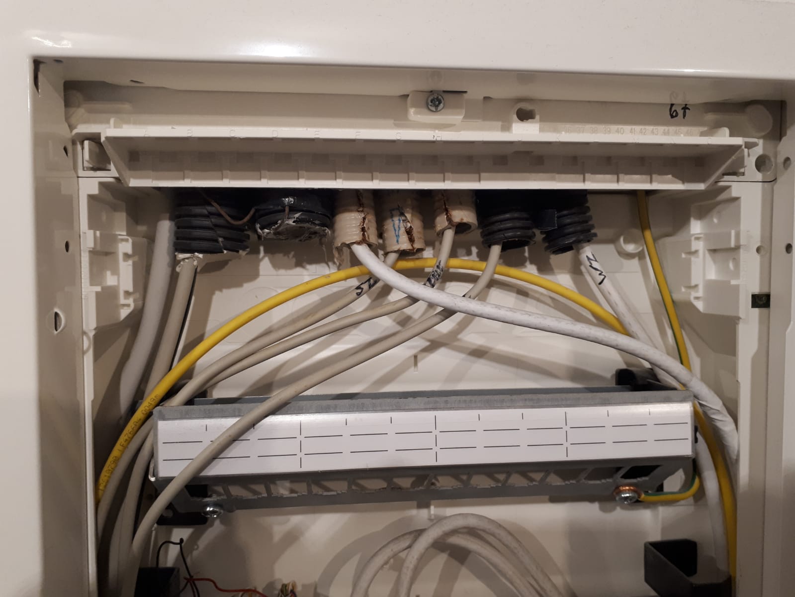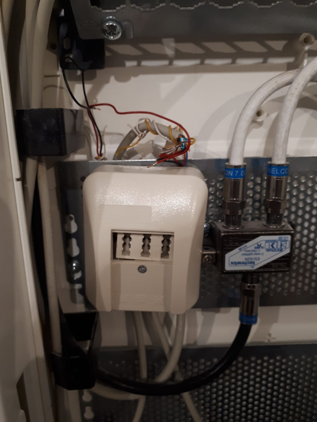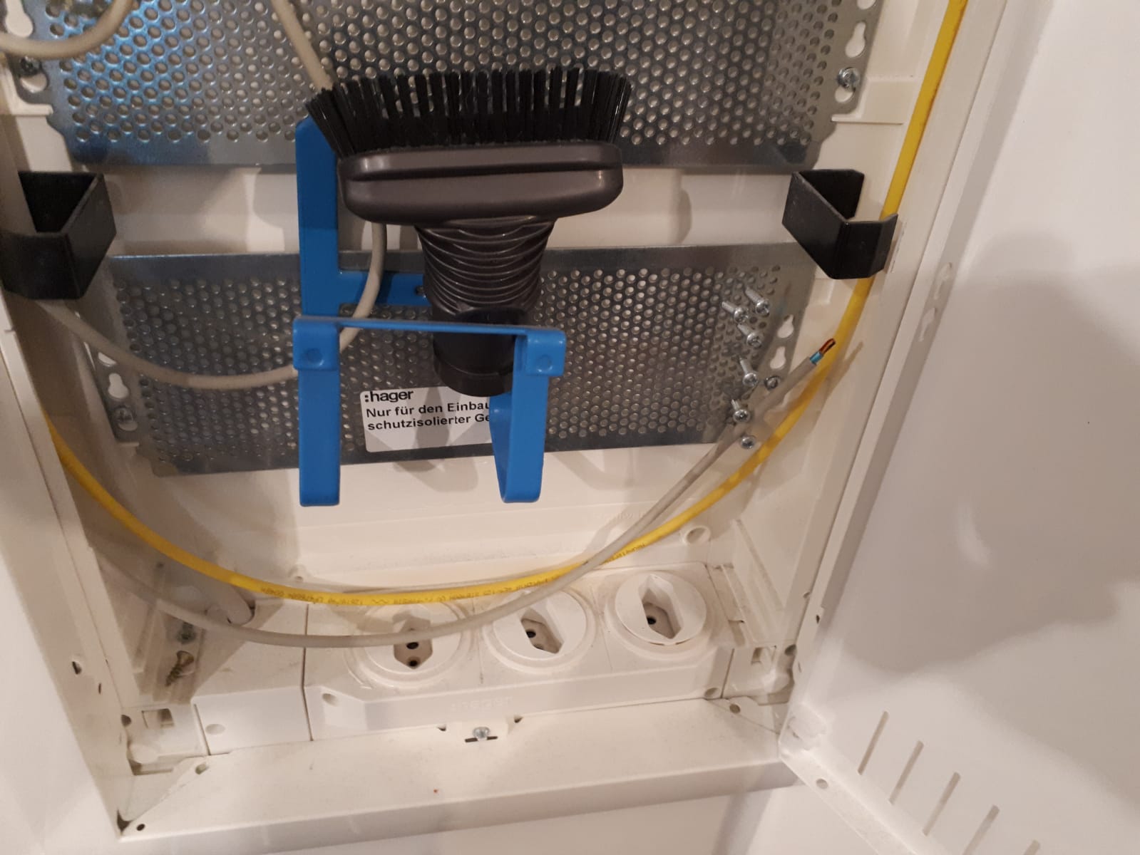 Am Anfang war die Telefondose an meiner Eingangstür und wurde dann verlegt. Das hat ein Bekannter gemacht, der sich damit auskennt, auch der Techniker meinte, das sei in Ordnung. Habe meinen PC und die Konsole per Lankabel angeschlossen, Fernseher und Handy über WLAN. PowerLAN und sonstige Spielereien habe ich nicht. Die Wago-Klemme ist ja jetzt nicht mehr da. Ich hänge mal ein Foto von dem Verteilerkasten an.