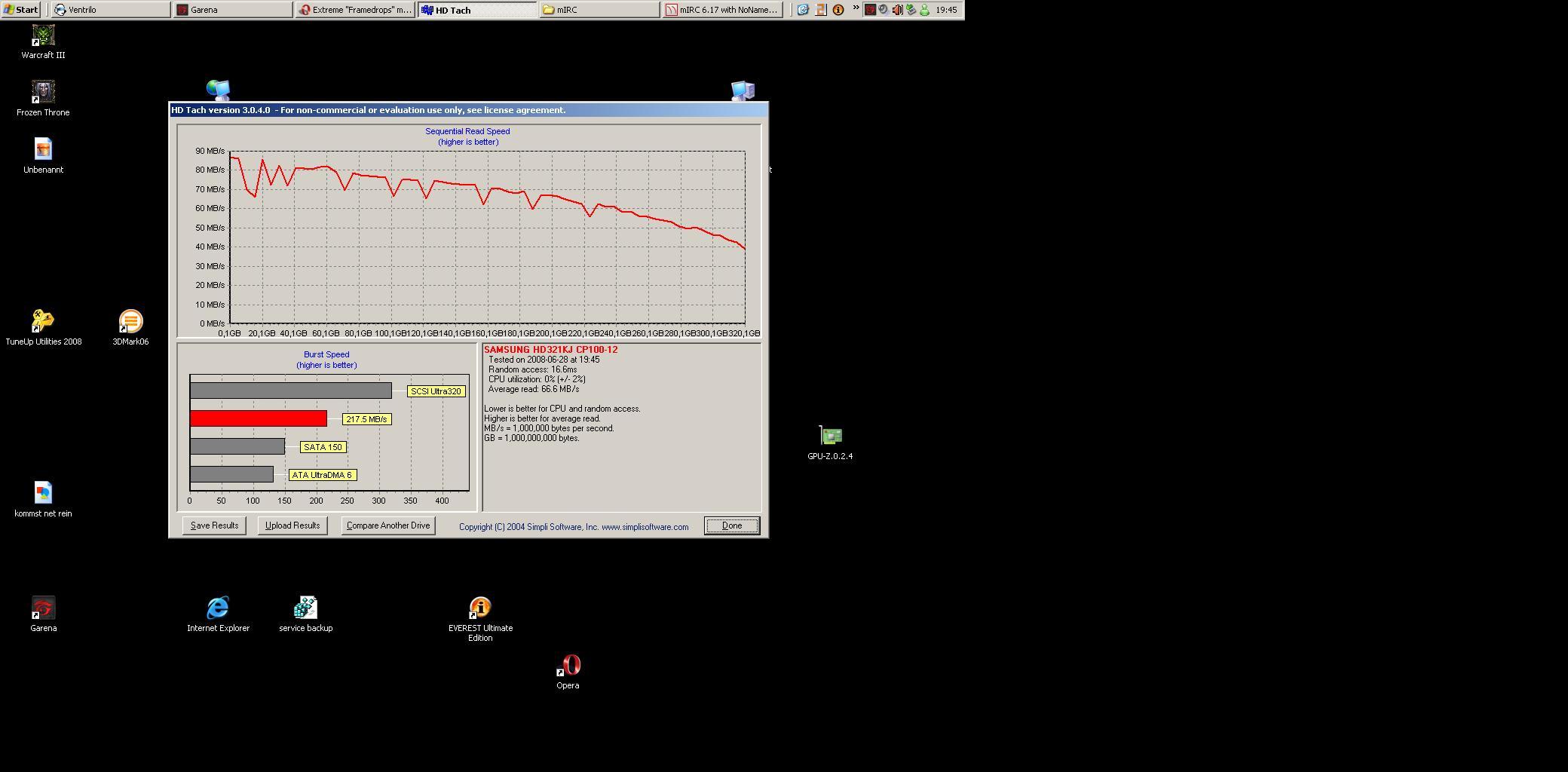 das es einbrüche beim Navigiren auf dem gebenchten laufwerk gibt ist klar, beim zugriff fällt die Kurve auch bei mir auf 1-5MB/s runter! die frage ist jedoch eher bleibt die Platte über mehrere benches konstannt? in deinem HD Tune diagramm ist auf jedenfall nichts abnormales zu erkennen