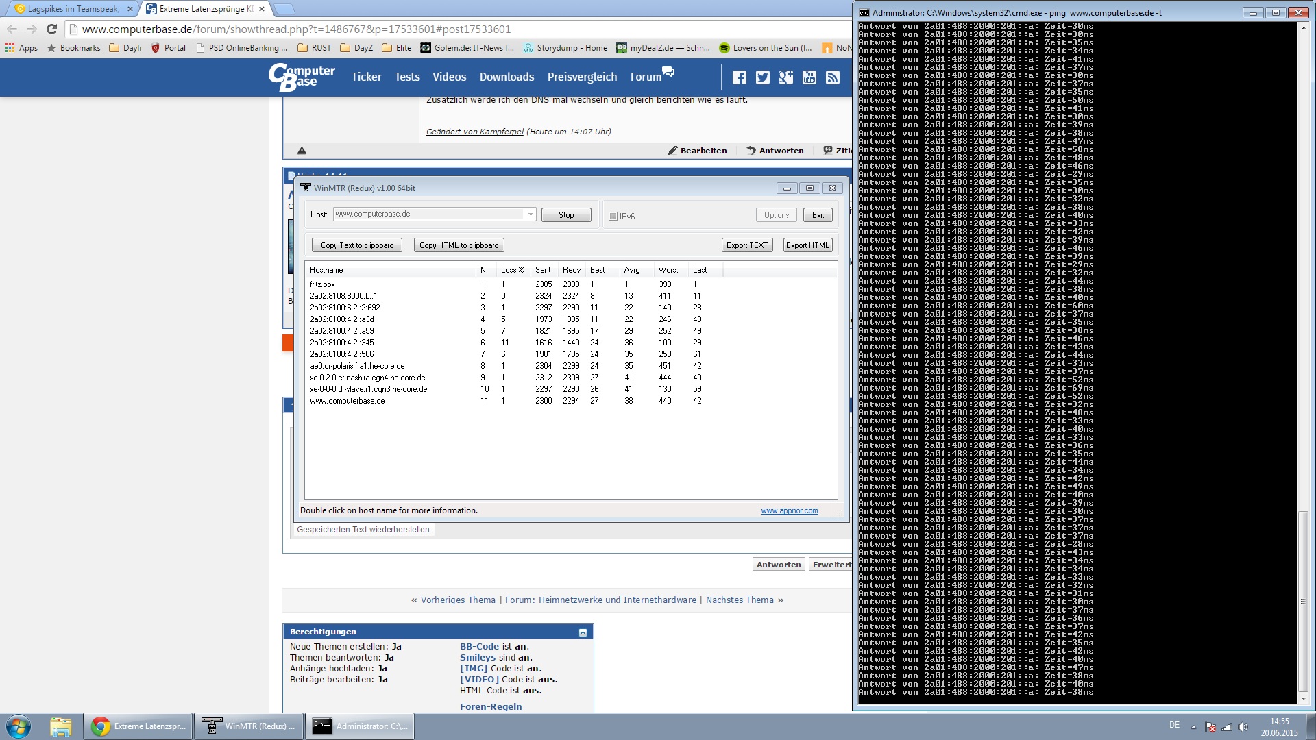 ich habe seit einigen Tagen massive Probleme mit Laggspikes in div. Onlinegames und ebenfalls im Teamspeak/Skype und auch merkbar in Twitch. Ping geht dann von ~30 ms auf weit über 1000ms.