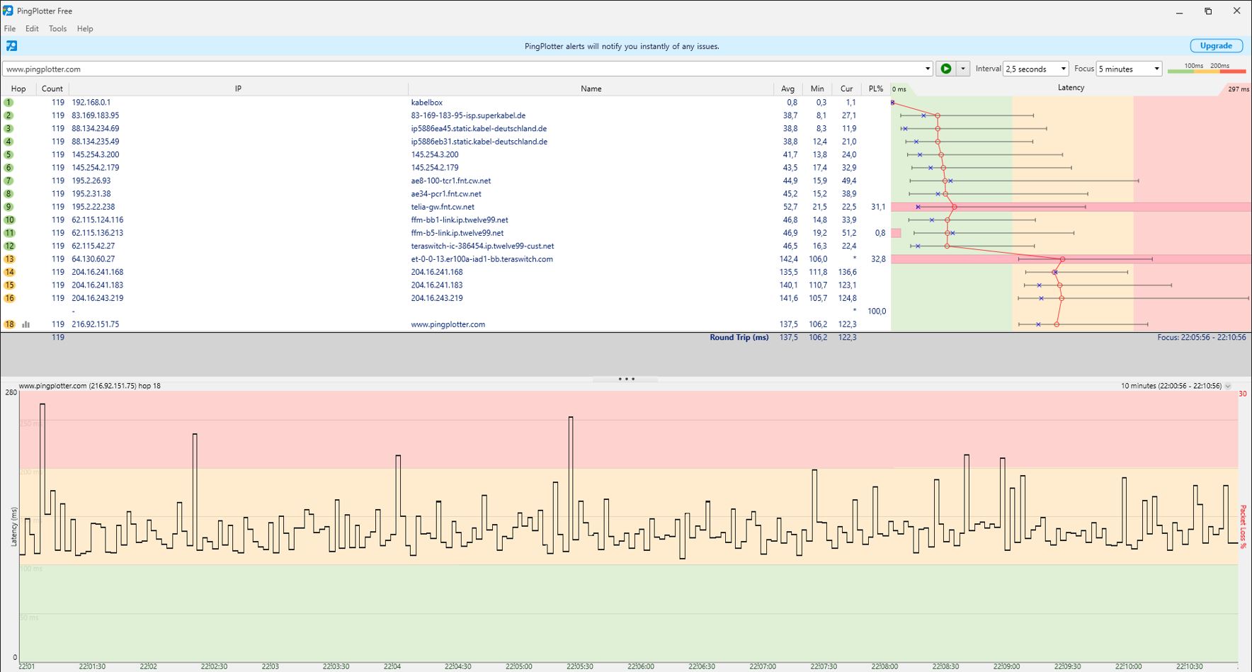 Habe bereits probiert den Router in einen anderen Raum zu stellen, wegen anderen Geräten. Habe bereits an einem anderen Gerät mit einem anderen Kabel ein PingPlotter gemacht jedoch immer das selbe Ergebnis.. Habe es auch in den Anhang gepackt.