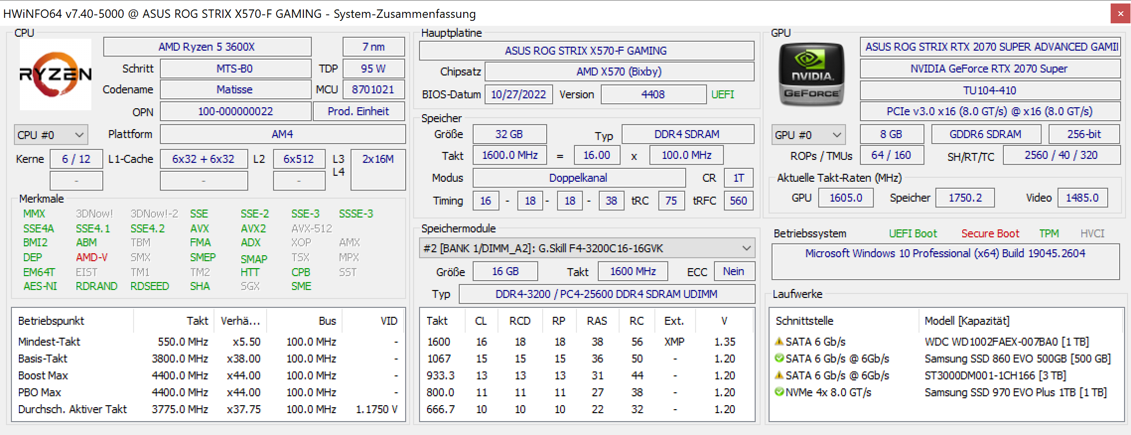 HDD / SSD: Samsung SSD 970 EVO Plus 1TB (Windows), Samsung SSD 860 EVO 500GB (Datenablage für Videoschnitt, etc.), Western Digital WDC WD1002FAEX-007BA0 und Seagate ST3000DM001-1CH166 (Daten/Backup/etc.)