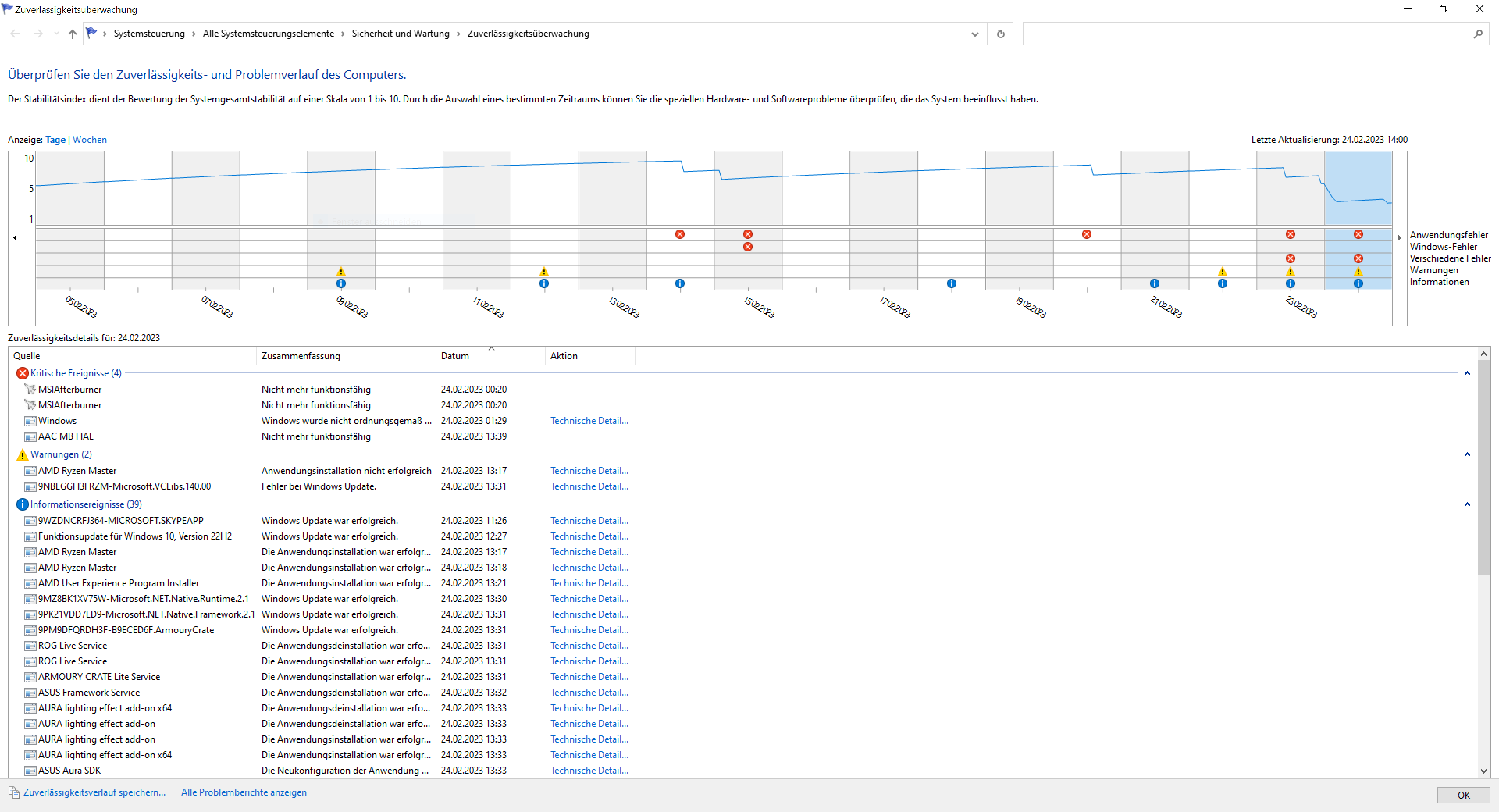 3. Zuverlässigkeitsverlauf 24.02: Ryzen Master wurde installiert. Hast du an den CPU Taktraten gespielt bevor die Framedrops gekommen sind?