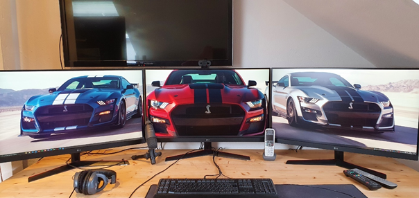 Wenn man dann mal mit der Arbeit durch ist, nimmt man die drei Monitore und verbringt einige schönes Stunden in Night City, Los Santos oder an der Kaspischen Grenze.