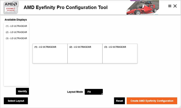 Nun wählt man 3x1 und kann dann aus den gelisteten Geräten die richtigen auswählen und auf die Positionen zuordnen. Der vierte Bildschirm kann dabei ignoriert werden, er kann danach mittels den Windowsanzeigeeinstellungen beliebig verändert werden und ist autark vom Eyefinetysetup. Beim Layoutmodus konnte ich keinen Unterschied zwischen den verschiedenen Presets feststellen und habe ihn daher immer auf Fit belassen.