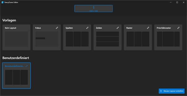 Hier kann die riesige Monitorfläche sinnvoll unterteilt werden. Wählt man das Preset „Spalten“ können die drei Monitore defacto als einzelne Bildschirme genutzt werden. Die einzige Umgewöhnung ist, dass Fenster nun per Windows + Pfeile verschoben werden müssen und man nicht mehr auf maximieren klicken darf, da ansonsten immer noch alle drei Monitore ausgefüllt werden. Damit ist der Computer nun zumindest nutzbar.