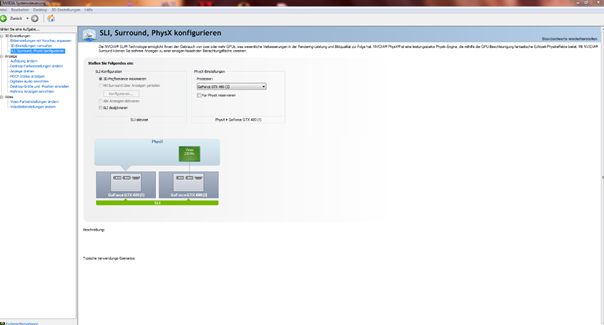 Aktivierte man allerdings SLI, konnte man ein interessantes Detail entdecken. „Mit Surround über die Anzeigen verteilen“ war damals und ist heute die Konfiguration für jedes Nvidiabasierte Multimonitorsetup. Ich wollte das durchaus mal testen und habe mir daher kurzerhand einen weiteren Monitor besorgt. Der enorme Vorteil, den AMD damals bot war, dass lediglich eine Grafikkarte mit aktivem Displayportadapter für den Betrieb dreier Monitore nötig war. In Ermangelung eines DP-Anschlusses war das bei den Fermikarten nicht möglich und eine zweite Grafikkarte mit einem weiteren Taktgeber wurde nötig. Wollte man lediglich drei einzelne Monitore nutzen, konnte man z.B. eine günstige G210 verbauen, die den dritten Bildschirm befeuerte. Leider ließ sich so aber kein Surroundsetup zum Spielen einrichten, dafür wurden zwei gleiche GPUs benötigt.